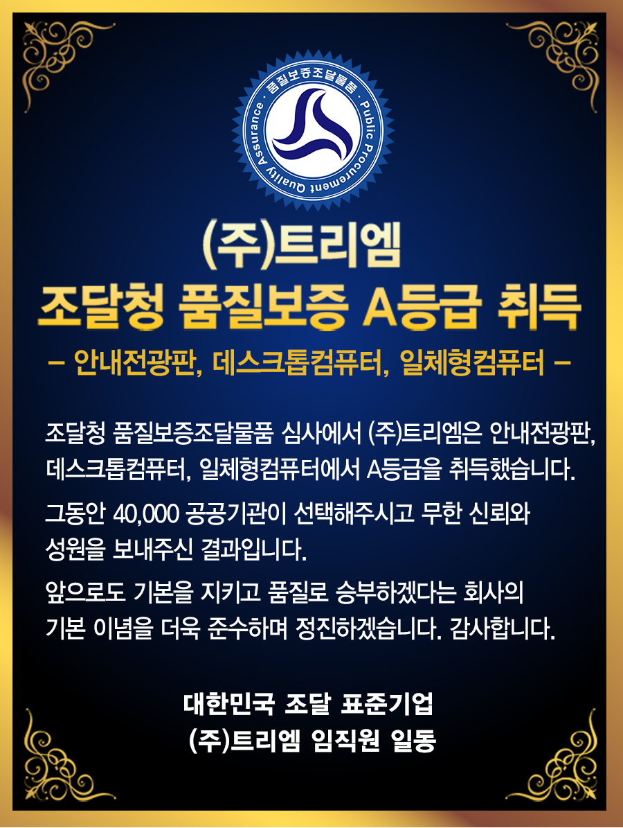 [(주)트리엠 조달청 품질보증 A등급 취득] - 안내전광판, 데스크톱컴퓨터, 일체형컴퓨터 -