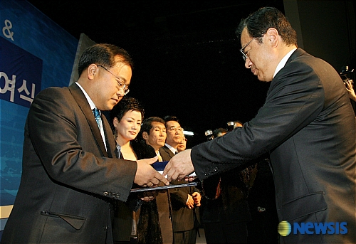 20일 서울 방이동 올림픽공원 올림픽홀에서 열린 2007 소기업소상공인대회에서 이현재 중소기업청장(오른쪽)이 모범 소기업소상공인에게 표창을 전달하고 있다. /서경리기자 sougr@newsis.com